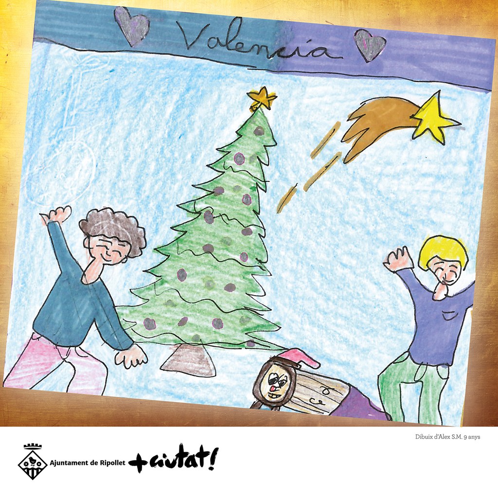 Alex S.M. de 9 anys ha estat el guanyador del concurs "Un desig per compartir", que anulament convoca l'Ajuntament de Ripollet per il·lustar la felicitació oficial de Nadal. El dibuix triat està dedicat als damnificats de València, amb uns cors i l'Estrella d'Orient amb una estela de fang.