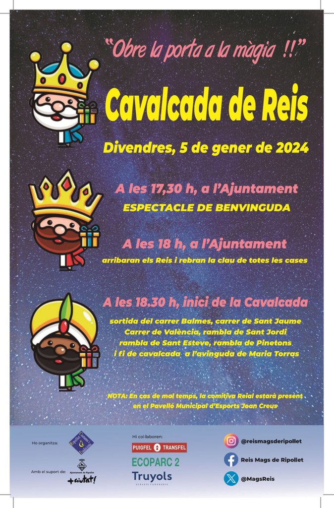 Tanmateix, si la climatologia ho permet i no plou, se celebrarà la tradicional Cavalcada de Reis que, des de fa 55 anys, Ripollet Costums i Tradicions organitza amb el suport de l'Ajuntament i la col·laboració d'entitats i voluntariat.