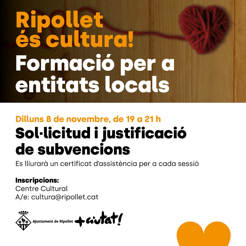 Després que aquest mes d'octubre s'hagin iniciat els cursos i tallers del Centre Cultural, ara torna el programa formatiu per a les entitats locals i ho fa de manera presencial. La primera sessió serà el dilluns 8 de novembre, de 19 a 21 h, i girarà entorn de la Sol·licitud i justificació de subvencions, coincidint amb la publicació, al mes de novembre, de la convocatòria de subvencions en règim de concurrència competitiva tant per a les entitats culturals com esportives.