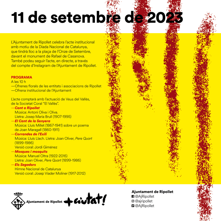 Anirà a càrrec de diverses entitats i institucions municipals, en un acte que començarà a les 10 h i on hi participarà la coral Veus del Vallès de la Societat Coral “El Vallès”, que oferiran una actuació musical. L'acte es podrà seguir en directe, a través del canal d'Instagram @ajripollet.