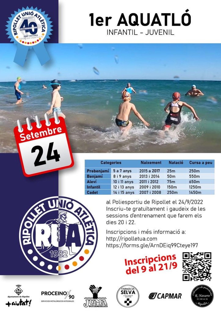 Aquest dissabte, 24 de setembre, se celebrarà el 1r Aquatló infantil-juvenil Vila de Ripollet. Es tracta d'una competició gratuïta, que organitza la Ripollet Unió Atlètica (RUA) al Poliesportiu. Les inscripcions, que es van tancar dimecres, van representar tot un èxit de participació, ja que es van acabar inscrivint 83 infants i joves d'entre 5 i 16 anys.