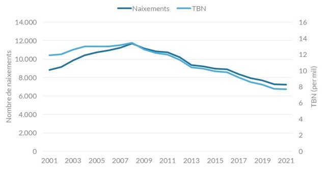 La caiguda en la xifra de naixements dels anys 2021 i 2020 reflecteix l'impacte de la COVID-19, sumada a la tendència de descens de natalitat de les últimes dècades causat, per una banda, per la disminució del nombre de persones en edat reproductiva i, per l'altra, per l'evolució de la fecunditat d'aquesta població.