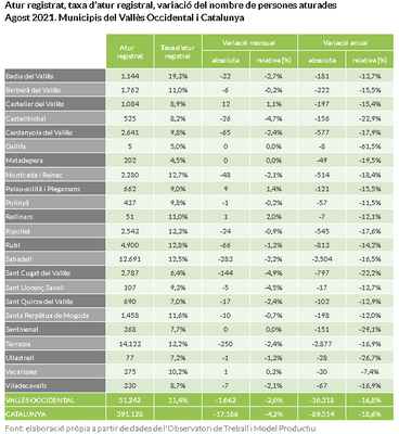 Segons fonts de l'Observatori del Consell Comarcal del Vallès Occidenta, a la comarca, el mes d'agost de 2021 finalitza amb 51.242 persones aturades. Respecte al juliol, l'atur disminueix un 2%, el que representa 1.062 persones desocupades menys a la comarca. La taxa d'atur registral provisional se situa en el 11,4%.