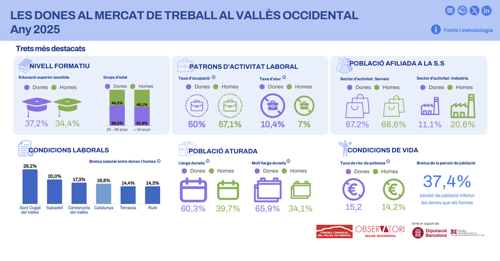 Les dades mostren que les dones del Vallès Occidental tenen un nivel educatiu superior als homes, però aquesta xifra no es veu reflectida en el mercat laboral: l’any 2025 la taxa d’activitat de les dones a la comarca és del 55,9%, gairebé sis punts per sota de la masculina (61,8%), mentre que la taxa d’ocupació és del 49,6% enfront del 57% dels homes.