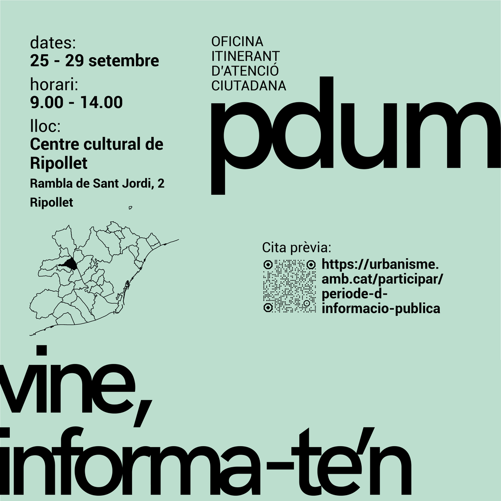 La pròxima setmana el Pla Director Urbanístic Metropolità (PDUM) visitarà Ripollet i s'instal·larà cada dia del 25 al 29 de setembre, de 9 a 14 h, al Centre Cultural per donar respostes a les necessitats actuals de la població apostant per un model de desenvolupament sostenible, equitatiu i cohesionat.