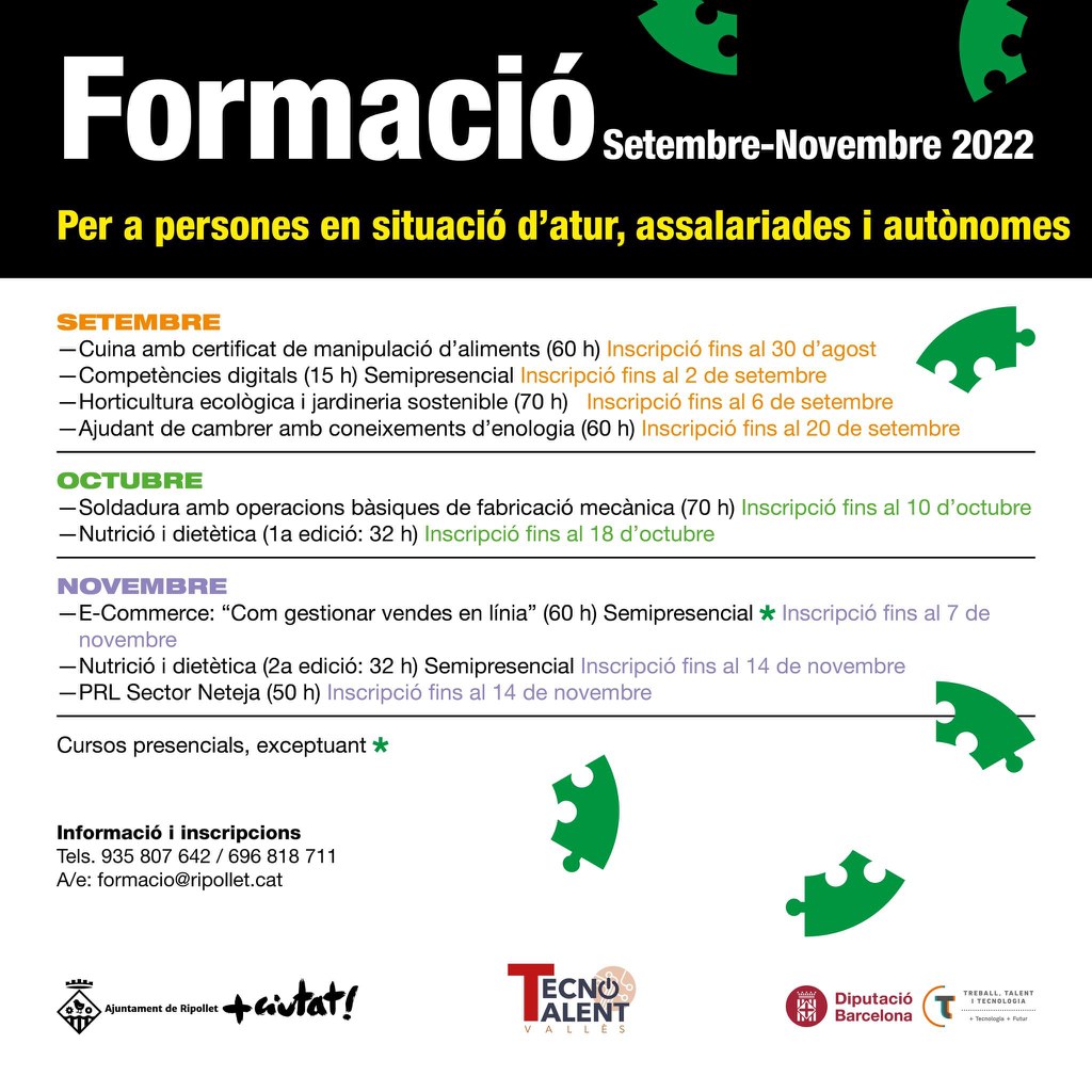 L’Ajuntament de Ripollet, des de l’àmbit de Desenvolupament Econòmic, ha programat, durant el darrer trimestre del 2022, prop d’una desena d’accions de formació teòric-pràctica que tenen com a objectiu garantir i millorar la formació, qualificació, capacitació i les competències professionals de les persones treballadores, així com afavorir la cerca de feina o el manteniment en el mercat de treball. Els cursos, majoritàriament presencials, corresponen a tres tipus de projectes. D’una banda, els de la Diputació de Barcelona “Plans Locals d'Ocupació” Catàleg 2021-2023: Xarxa de Governs Locals 2022 i “Treball, Talent i Tecnologia” (TecnoTalent Vallès), i, d’altra, a les accions de “Formació Ocupacional Local” impulsades per l’Ajuntament de Ripollet.