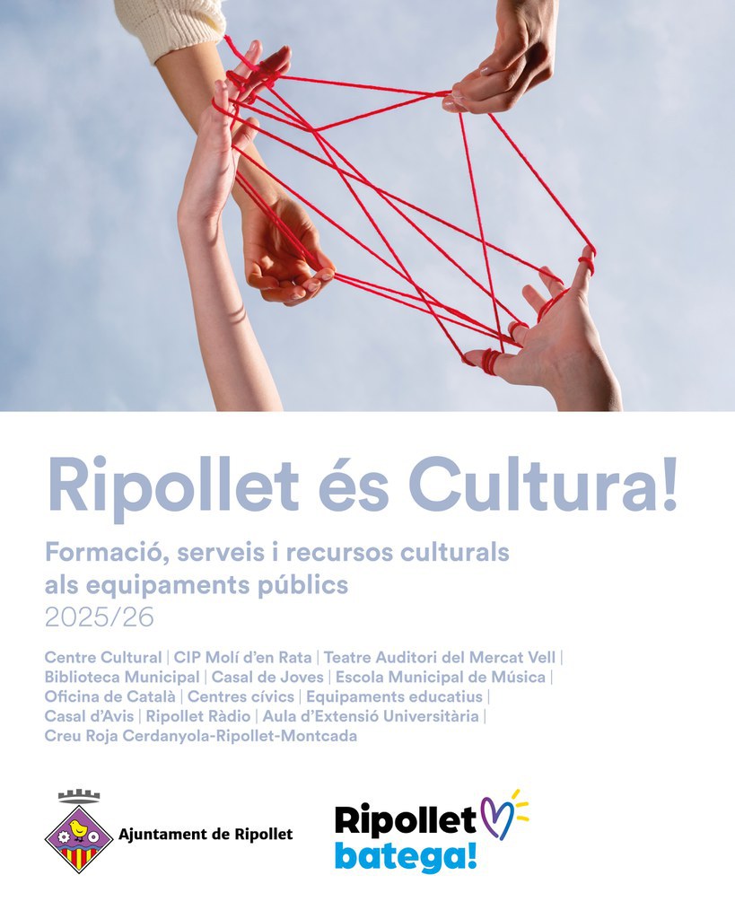 “Ripollet és Cultura!” també recull l’oferta formativa, de serveis i recursos culturals d’altres equipaments municipals, com ara la Biblioteca, el CIP Molí d’en Rata, el Teatre Auditori del Mercat Vell, el Casal de Joves o Ripollet Ràdio. També podeu trobar els cursos i tallers de l’Escola Municipal de Música, l’Oficina de Català, diferents equipaments educatius i cívics, el Casal d’Avis, l’Aula d’Extensió Universitària i Creu Roja.