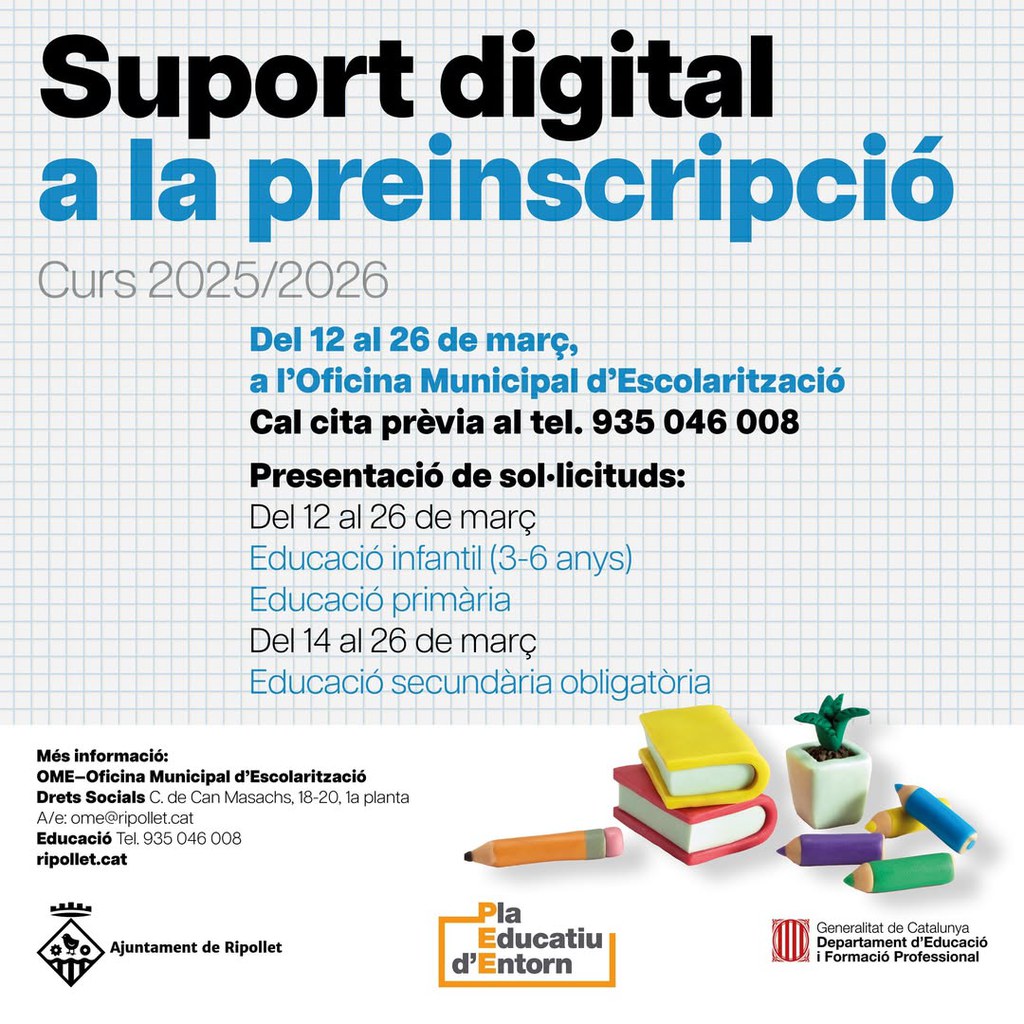 Des de l'Ajuntament de Ripollet, a través de l'Oficina Municipal d'Escolarització (OME), en el marc del Pla Educatiu d’Entorn, s'ha creat un espai de suport digital a la preinscripció, ja que la sol·licitud només es pot fer de forma telemàtica. Aquest servei s’oferirà a totes les famílies que ho necessitin, del 12 al 26 de març, a les oficines de Drets Socials (carrer de Can Masachs, 18-20 primera planta). Per a utilitzar aquest servei cal reservar cita prèvia al telèfon 935 046 008, o a ome@ripollet.cat.