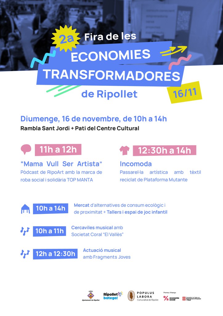 La jornada oferirà un mercat d’alternatives de consum ecològic i de proximitat, tallers, espai de joc infantil i propostes artístiques vinculades al tèxtil. A les 11 h, el pòdcast "Mama Vull Ser Artista", de RipoArt, entrevistarà Lamin Sarr, un dels fundadors de Top Manta, la marca de roba social i solidària del Sindicat Popular de Venedors Ambulants.