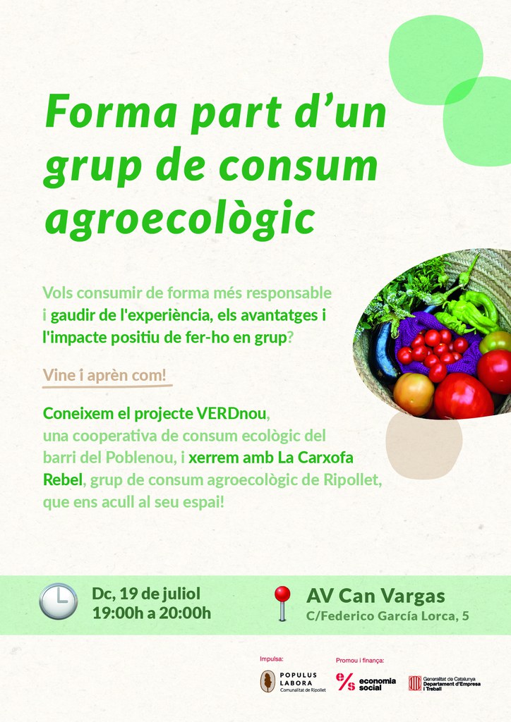 Així doncs, Populus Labora ha preparat un acte per engrescar tothom qui vulgui a participar en aquest grup de consum agroecològic de Ripollet, La Carxofa Rebel. A més, la trobada es realitzarà a la seu d'aquesta agrupació, que està ubicada al local de l'AV Can Vargas (c. de Federico García Lorca, 5). L'acte comptarà amb la participació de VERDnou, una cooperativa de consum ecològic del barri del Poblenou, que explicarà la seva experiència. Per a més informació, populuslabora@comunalitat.cat o @populuslabora.