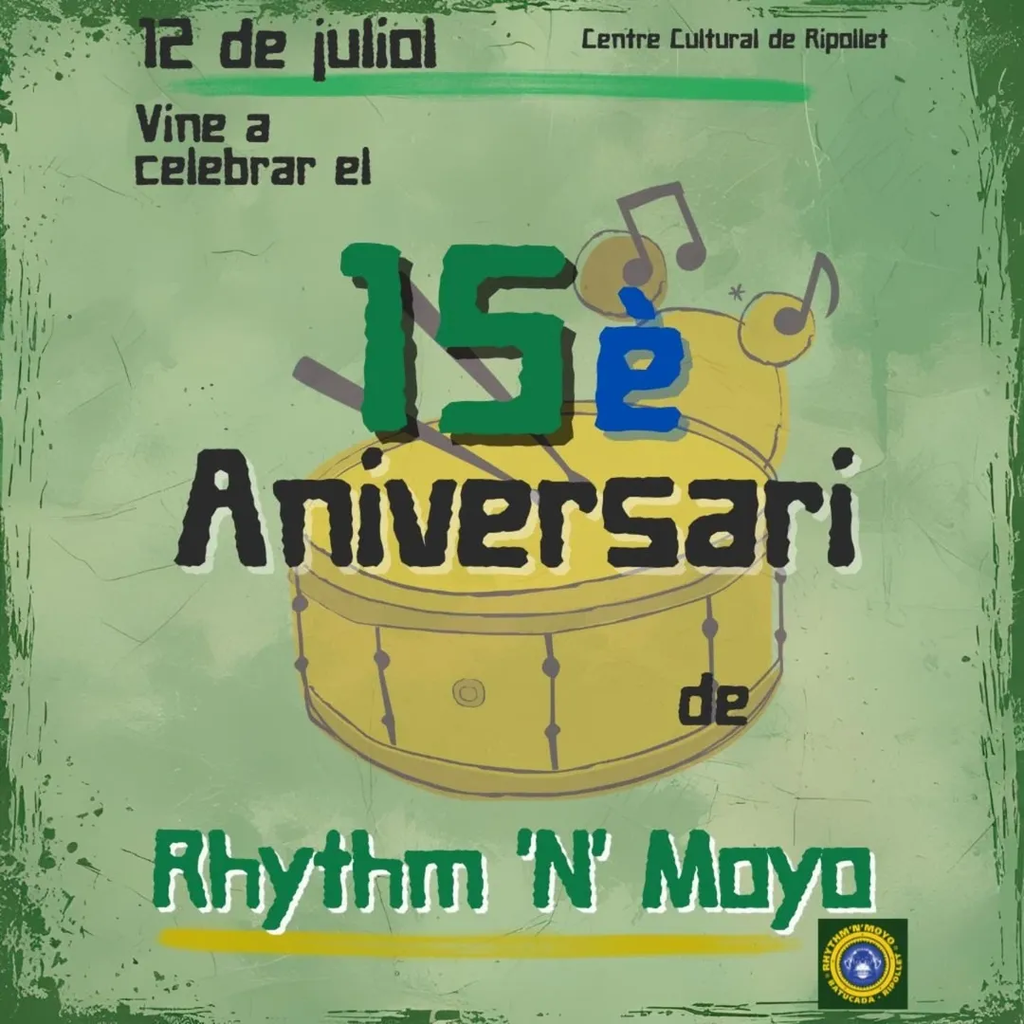 Aquest dissabte, 12 de juliol, l’associació Rhythm’n'Moyo celebra el seu 15è aniversari amb una jornada festiva oberta a tothom, al pati del Centre Cultural de Ripollet, que s’allargarà des del migdia fins ben entrada la matinada. L’esdeveniment, organitzat amb el suport d’altres entitats locals, vol ser una gran festa de poble per compartir i reviure una trajectòria de quinze anys plena de música, comunitat i cultura popular.