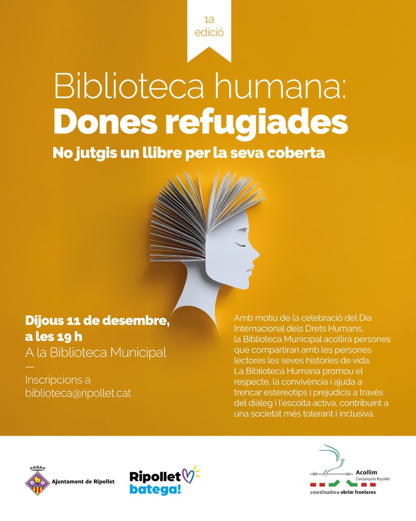 La Biblioteca de Ripollet celebrarà la primera edició de la Biblioteca Humana, una activitat que tindrà lloc amb motiu del Dia Internacional dels Drets Humans, que es commemora el 10 de desembre, i que té com a finalitat fomentar el respecte, la convivència i l’empatia a través de la conversa directa entre persones. A Ripollet, aquesta primera edició es desenvoluparà sota el lema “No jutgis un llibre per la seva coberta” i girarà entorn la història de tres dones refugiades, amb la col·laboració d’Acollim Cerdanyola Ripollet. Se celebrarà dijous 11 de desembre, a les 19 h, a la Biblioteca Municipal.