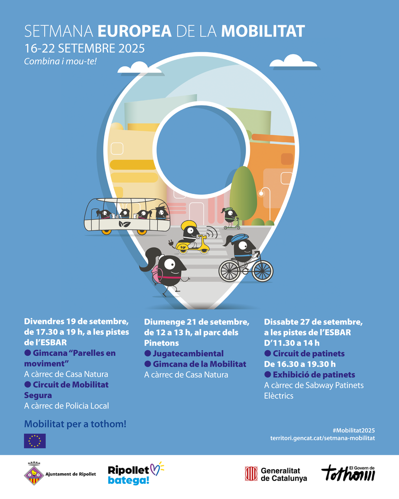 L’Ajuntament de Ripollet se suma un any més a la Setmana Europea de la Mobilitat, que enguany se celebra del 16 al 22 de setembre sota el lema Mobilitat per a tothom. Aquesta iniciativa europea té com a objectiu promoure hàbits de desplaçament més sostenibles i saludables, com anar a peu, en bicicleta, en transport públic o en vehicles de mobilitat personal, i conscienciar la ciutadania sobre la importància de reduir la contaminació i millorar la qualitat de vida urbana.