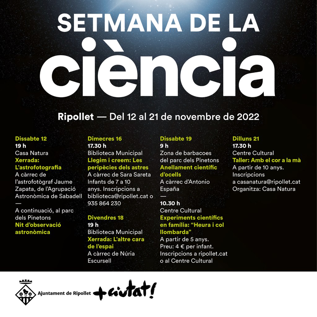 Des d'aquest dissabte, 12 de novembre, i fins al dilluns 21 de novembre, Ripollet acollirà la primera Setmana de la Ciència. Es tracta d'una petita mostra que oferirà la possibilitat de conèixer i difondre algunes de les branques de la ciència i la seva utilitat al món. La celebració d'aquesta jornada és un primer impuls per obrir la porta a què es pugui repetir en pròximes edicions. El tret de sortida del programa d'actes serà el pròxim dissabte 12 de novembre amb la xerrada 'L'astrofotografia', a càrrec de l'astrofotògraf Jaume Zapata, de l'Agrupació Astronòmica de Sabadell, que parlarà sobre l'art d'extreure imatges del cel. Serà a les 19 hores, a la Casa Natura. Seguidament, es farà una nit d'observació astronòmica al parc dels Pinetons. Són unes activitats obertes a tothom, sense inscripció.