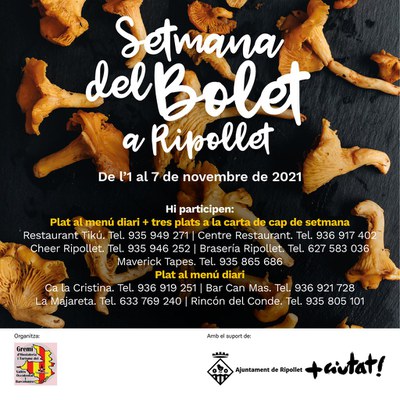 Després de la bona acollida de la Ruta Gastronòmica de Sant Jordi a Ripollet, alguns restaurants locals s’han sumat a la iniciativa del Gremi d’Hostaleria i Turisme del Vallès Occidental i Barcelonès d’oferir plats i menús amb un dels ingredients més preuats de la tardor, els bolets. La Setmana del Bolet a Ripollet, que se celebrarà de l’1 al 7 de novembre, compta amb el suport de l’Ajuntament de Ripollet, que convida a la ciutadania a visitar els restaurants de la ciutat i gaudir de la cuina de temporada amb productes de proximitat.