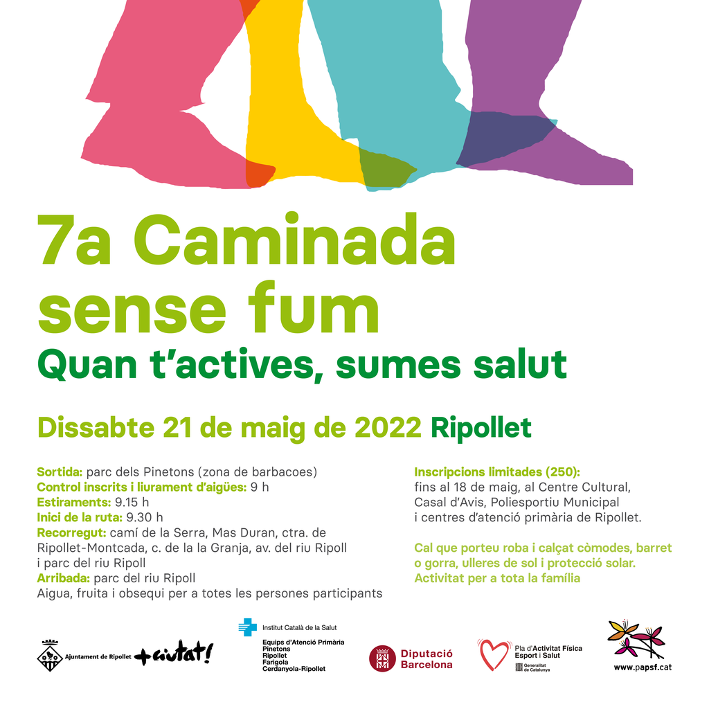L’activitat està adreçada a tota la família i enguany porta per títol ‘Quan t’actives, sumes salut’. Les inscripcions estan limitades a 250 persones i es poden realitzar fins al 18 de maig a diferents equipaments i centres d'atenció primària de Ripollet.