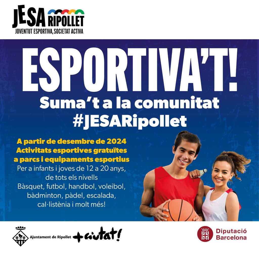 A Ripollet, les activitats començaran el mes de desembre, amb un tastet de diferents disciplines, com ara una jornada de cal·listènia i beisbol (dilluns, 9 de desembre. A les 11 h, al parc de Primer de Maig), pàdel i bàsquet (dimecres, 18 de desembre, a les 17.30 h, al Poliesportiu Municipal) i escalada (Búlder) i vòlei (dilluns, 23 de desembre, a les 11 h, al Poliesportiu Municipal). L’objectiu d’aquest tastet és animar a joves i adolescents a sumar-se a la Comunitat #JESARipollet.