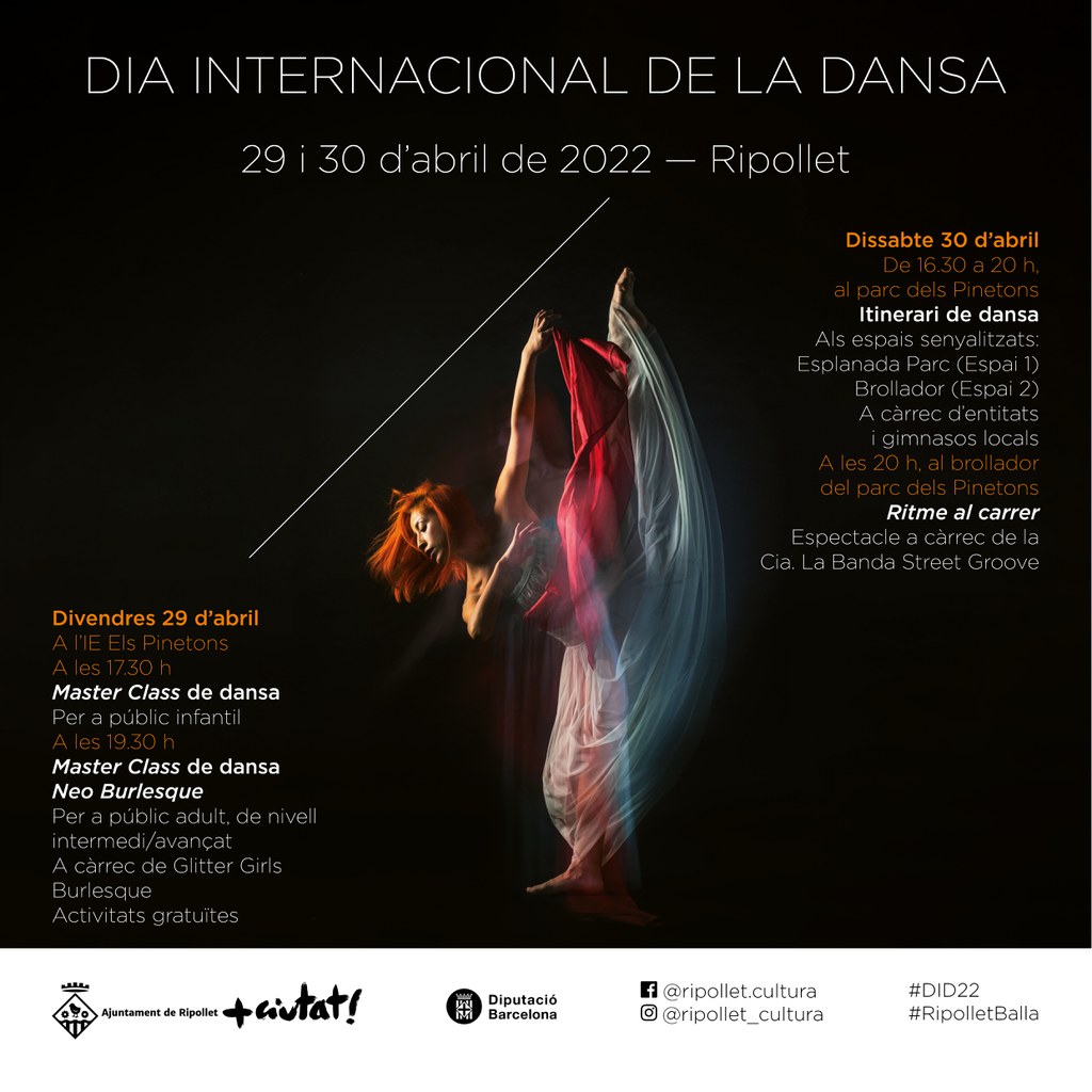 Aquest cap de setmana, Ripollet se suma un any més a la celebració del Dia Internacional de la Dansa. Serà la 5a edició d'una festa que té com a protagonista els diferents estils i varietats del ball i la dansa. Ripollet ho celebrarà amb diverses activitats, aquest divendres 29 i dissabte 30 a la tarda.