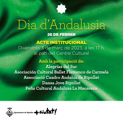 Una celebració, organitzada des de l’Ajuntament, amb el suport d’algunes de les entitats locals de cultura andalusa, com són l’Asociación Rociera Andaluza Alegrías del Sur, Dansa Jove Ripollet, el Cuadro Andaluz de Ripollet i l’Asociación Cultural Ballet Flamenco de Carmela. Aquest dimarts, com és tradicional, es realitzarà la hissada de la bandera d’Andalusia, que onejarà fins al cap de setmana.
