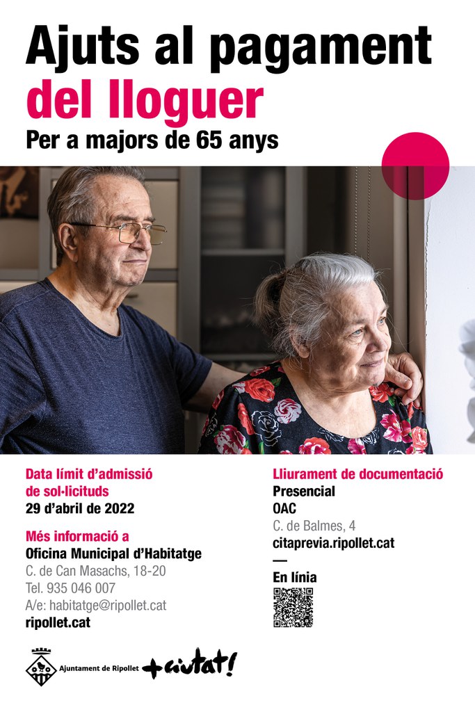 Més informació, a l'Oficina Municipal d'Habitatge (c. de Can Masachs, 18-20, telèfon 935 046 007) o al correu electrònic a habitatge@ripollet.cat.