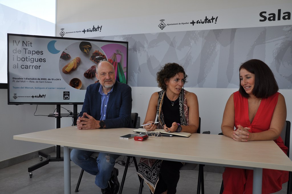 Sergi Vera, president de la UCR; Txell Caler, regidora d'Ocupació, Empresa i Comerç, i Susana Rodríguez, presidenta de l'Associació de Venedors i Comerciants del Mercat Municipal, durant la presentació de la V Nit de Tapes i botigues al carrer.