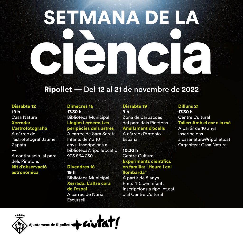 Es tracta d’una petita mostra que oferirà la possibilitat de conèixer i difondre algunes de les branques de la ciència i la seva utilitat al món. La celebració d’aquesta jornada és un primer impuls per obrir la porta a que es pugui repetir en properes edicions. El tret de sortida al programa serà el proper dissabte 12 de novembre amb la xerrada ‘L’astrofotografia’, a càrrec de l’astrofotògraf Jaume Zapata, de l’Agrupació Astronòmica de Sabadell, que ens parlarà sobre l’art d’extreure imatges del cel. Serà a les 19 hores, a la Casa Natura. Seguidament es farà una nit d’observació astronòmica al parc dels Pinetons. Obert a tothom, sense inscripció.