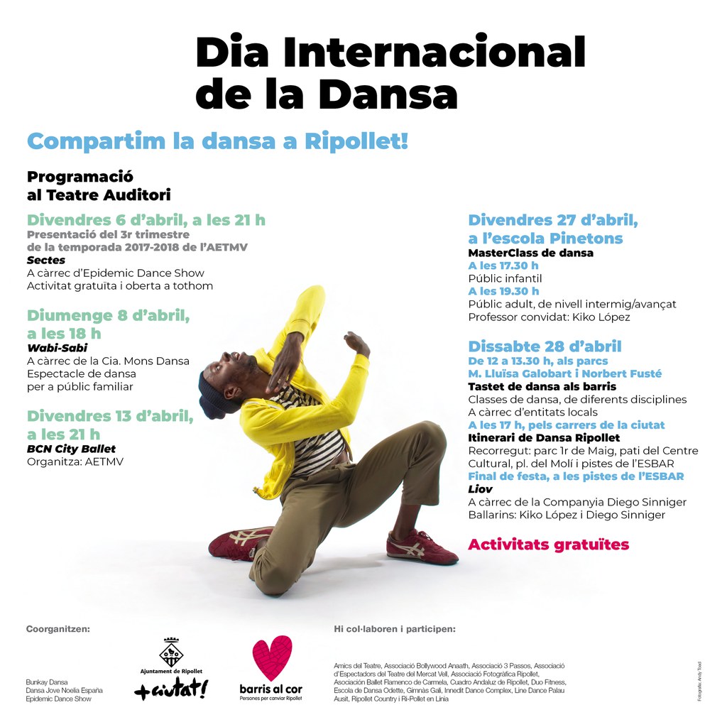Aquest any és la segona edició, plena d'activitats infantils i familiars, gratuïtes i obertes a tothom. El programa d'actes del Dia Internacional de la Dansa compta amb el suport del Patronat Municipal d'Esports, el Patronat Municipal de Cultura i l'Ajuntament de Ripollet.