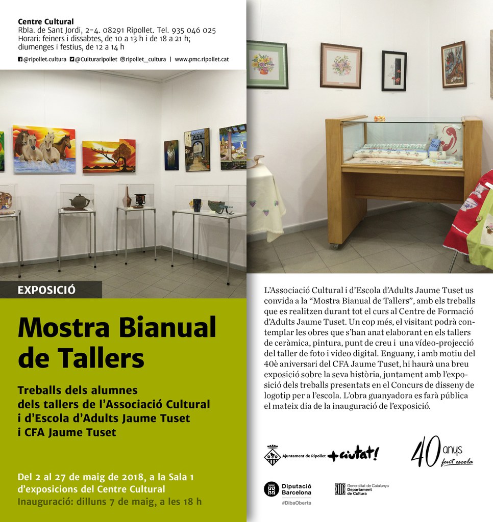 Aquesta exposició estarà ubicada a la Sala 1 d'exposicions del Centre Cultural i es podrà visitar fins el 27 de maig. Les persones que la visitin podran contemplar les obres que s'han anat elaborant en els tallers de ceràmica, pintura, punt de creu i una vídeo-projecció del taller de foto i vídeo digital. Enguany, i amb motiu del 40è aniversari del CFA Jaume Tuset, hi haurà una breu exposició sobre la seva història, juntament amb l'exposició dels treballs presentats en el Concurs de disseny de logotip per a l'escola. L'obra guanyadora es farà pública el mateix dia de la inauguració de l'exposició.