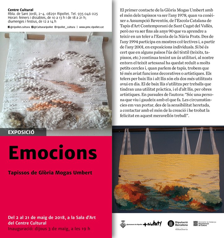 Aquesta tarda, a les 19 hores, el tinent d'alcalde de Cultura, Oriol Mor, presidirà la inauguració de l'exposició "Emocions. Tapissos de Glòria Mogas Umbert". També presidirà el proper 7 de maig, a les 18 h, la Mostra bianual de tallers dels alumnes de l'Associació cultural i d'Escola d'adults Jaume Tuset i CFA Jaume Tuset.