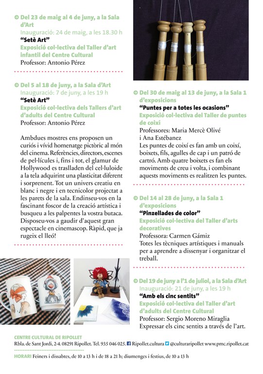 L'exposició col·lectiva del taller d'art infantil comença el 23 de maig i acaba el 4 de juny, i l'exposició col·lectiva del taller d'art d'adults serà del 5 al 18 de juny.