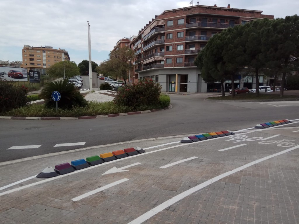 Coincidint amb la commemoració de Dia contra l'LGTBI-fòbia, han acabat les primers tasques de manteniment dels carrils bici de la ciutat amb la instal.lació dels darrers separadors a l'avinguda de Maria Torras, pintats amb els colors de l'arc de Sant Martí.
