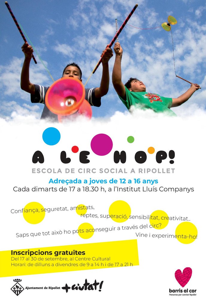 L'escola de circ social a Ripollet, Alehop! Iniciarà a l'octubre el seu segon curs i ho fa ampliant l'edat d'inscripció, de forma que podran participar joves de 12 a 16 anys. Les classes tindran lloc cada dimarts, de 17 a 18.30 h, al gimnàs de l'Institut Lluís Companys. Les inscripcions són gratuïtes i es poden fer del 17 al 30 de setembre, al Centre Cultural, de dilluns a divendres, de 9 a 14 h i de 17 a 21 h.
