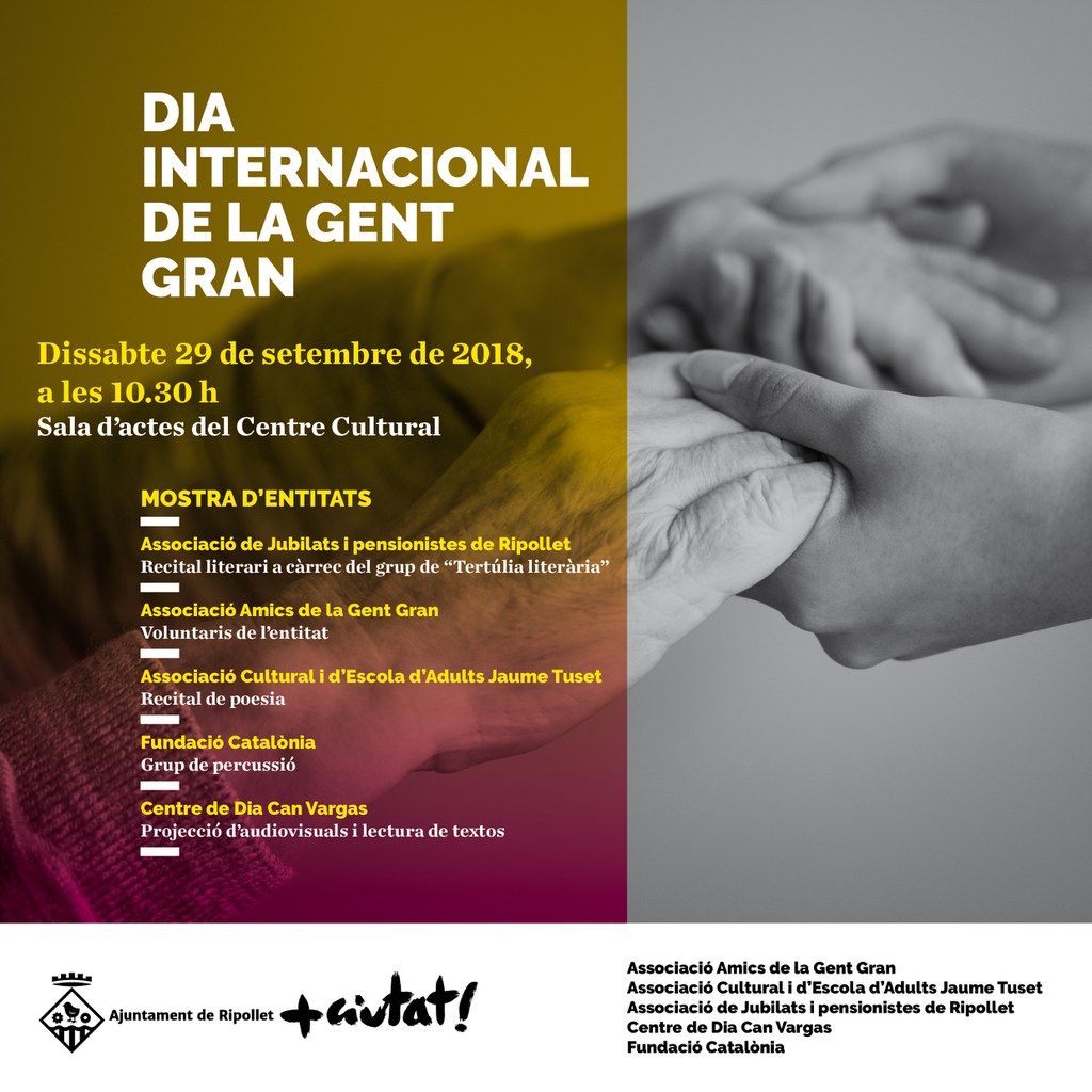 L'Ajuntament de Ripollet, amb la col·laboració de diverses associacions i col·lectius que treballen amb gent gran o que estan formades per persones grans, ha organitzat el pròxim dissabte, 29 de setembre, una mostra d'entitats per tal de celebrar el Dia Internacional de la Gent Gran, que se celebra cada 1 d'octubre. Amb aquest acte també es dóna inici a les activitats del programa 'Gent Gran, Gent Activa', que organitza el Departament de Serveis Socials i Gent gran pel curs 2018/2019.