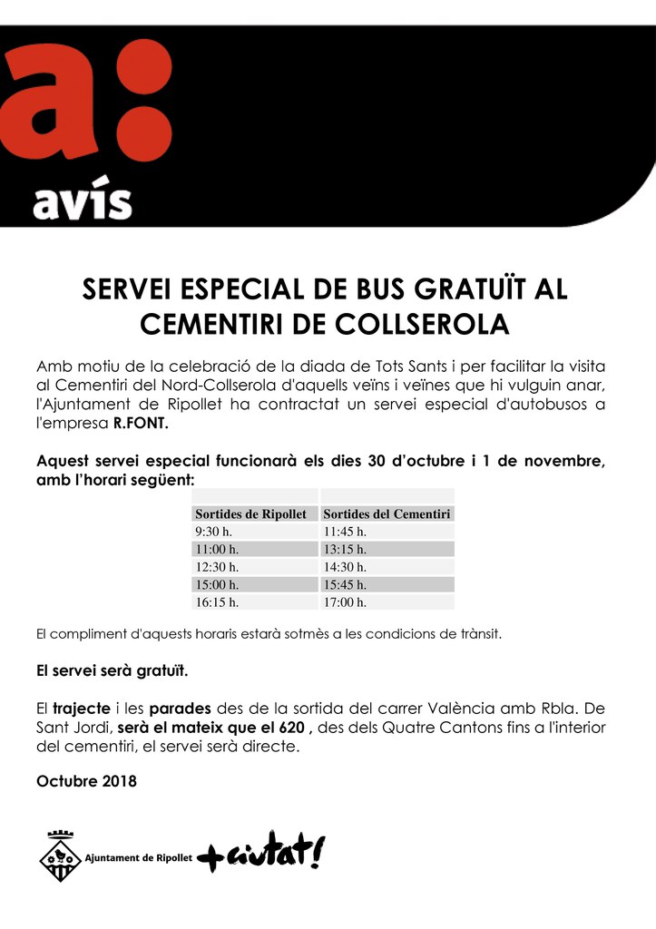 Quant al servei de bus, hi haurà cinc expedicions, que sortiran de Ripollet entre les 9.30 i les 16.15 h. Des del cementiri també sortiran 5 autobusos, entre les 11.45 h i les 17 h. El trajecte i les parades, des del carrer de València amb Rbla. de Sant Jordi serà el mateix que el del 620. A partir dels quatre cantons fins al cementiri, el servei serà directe.