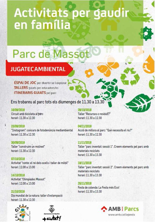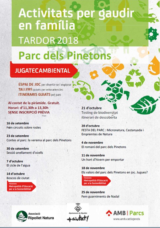 La Jugatecambiental és una iniciativa promoguda per l'Àrea Metropolitana de Barcelona amb la col·laboració de l'Ajuntament. De les 39 que hi ha a parcs i platges metropolitanes, Ripollet en té dues, als parcs Massot i dels Pinetons, gestionades per La Gresca i l'Associació Ripollet Natura, respectivament. Es tracta d'espais on les famílies, amb nens i nenes de totes les edats, poden compartir una estona de joc i experimentació mentre coneixen els valors dels parcs, a més d'altres continguts relacionats amb la sostenibilitat. A banda de les activitats guiades, també disposen d'un espai de joc i experimentació no dirigit. Consulteu la programació de tardor de les dues Jugatequesambientals a les imatges adjuntes.