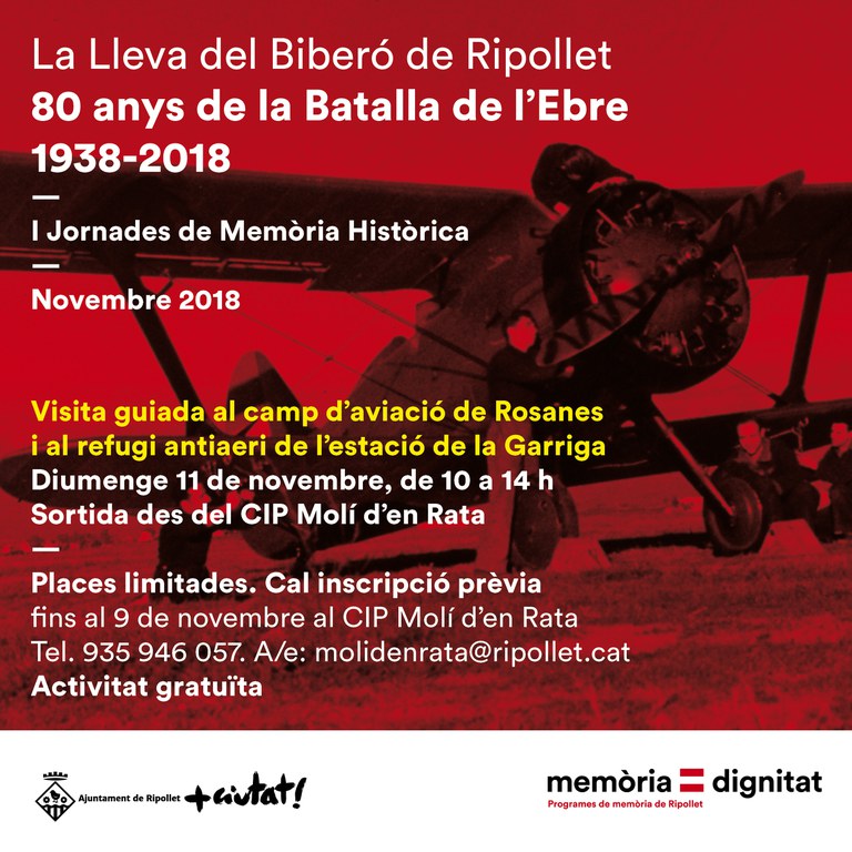 La Regidoria de Patrimoni i Memòria Històrica ha organitzat les primeres Jornades de Memòria Històrica de Ripollet, amb un programa d'actes que es desenvoluparà entre el 8 i el 25 de novembre. L'objectiu d'aquestes jornades és incentivar l'estudi, la recuperació, la protecció i la difusió de la memòria local. Aquesta primera edició s'ha volgut dedicar als joves de Ripollet de la Lleva del Biberó, que amb 17 anys van ser cridats al front de guerra per la 2a República. Alguns d'ells van combatre a la Batalla de l'Ebre, de la qual es commemoren els 80 anys.
