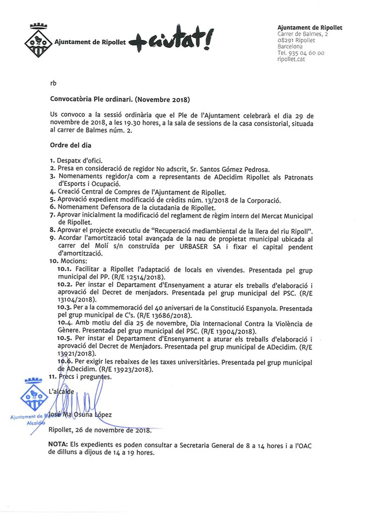 Aquesta sessió plenària tindrà lloc el pròxim dijous, dia 29 de novembre, a les 19.30 hores, a la Sala de Plens municipal (c. de Balmes, 2- edifici Molí d'en Ginestar). Al document adjunt trobaran els textos de les mocions que passaran a debat en aquesta sessió plenària.