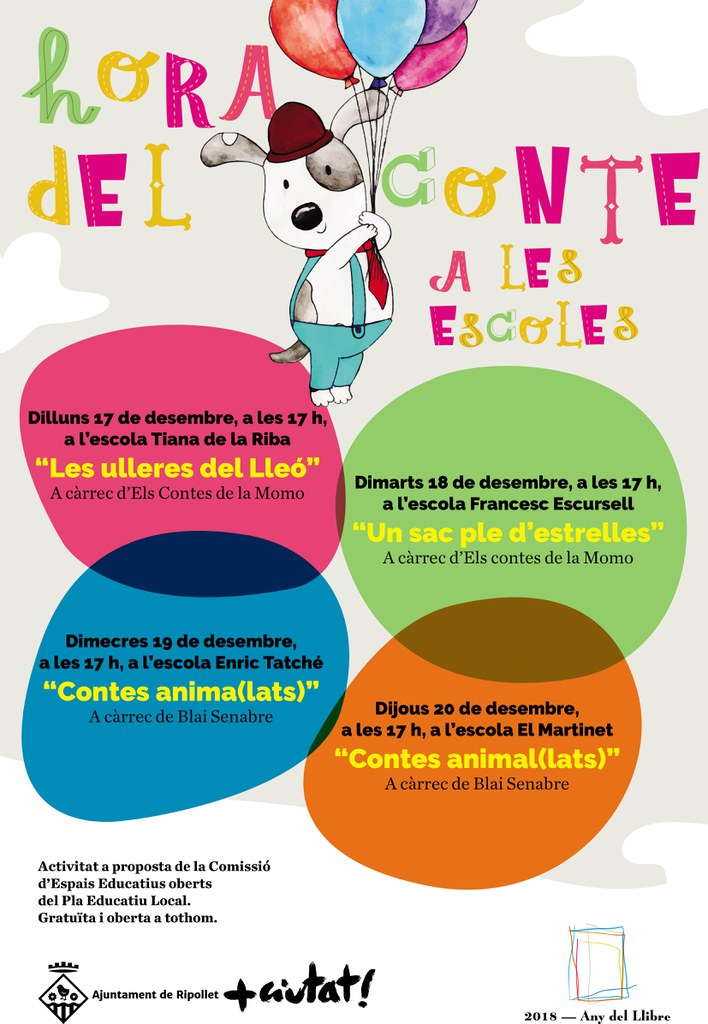 - Dimecres, 19 de desembre, a les 17 h. "Contes anima(lats)" a càrrec de Blai Senabre, a l'escola Enric Tatché.