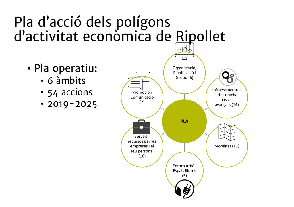 El Pla d'Acció dels p0lígons compta amb un total de 54 accions, distribuïdes en 6 àmbits d'actuació, amb un calendari d'execució fins al 2025. Els objectius estratègics del pla són: