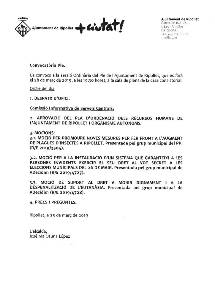 Aquest dijous, 28 de març, a les 19.30 h, tindrà lloc una nova sessió plenària, que compta amb 4 punt a l'ordre del dia. El Ple tindrà lloc a la Sala de Plens municipal (c. de Balmes, 2- edifici Molí d'en Ginestar). Als documents adjunts trobaran els textos de les tres mocions que passaran a debat en aquesta sessió plenària.