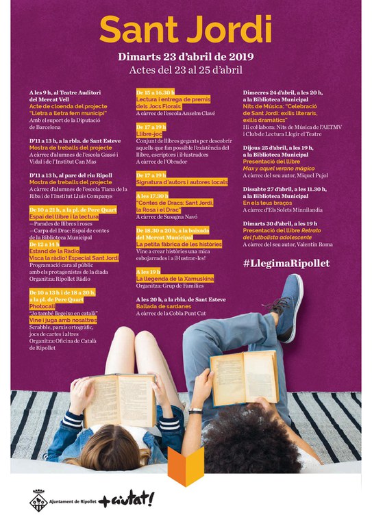 Un Sant Jordi on la literatura i les lletres es viuran al carrer i on també podrem gaudir dels contes, la il·lustració, la literatura infantil i juvenil que, juntament amb l'excel·lent treball i participació de les escoles i les entitats, conformen la gran diada de Sant Jordi a Ripollet.