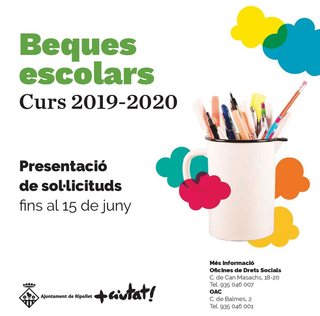 Fins al pròxim 15 de juny es mantindrà obert el termini per a la presentació de sol·licituds de beques, tant de menjador com per a l'adquisició de llibres i/o material escolar, per al curs 2019-2020. Poden sol·licitar-la les famílies dels alumnes empadronats a Ripollet que cursin de P3 a 4t d'ESO. Les sol·licituds es poden presentar telemàticament o de forma presencial.