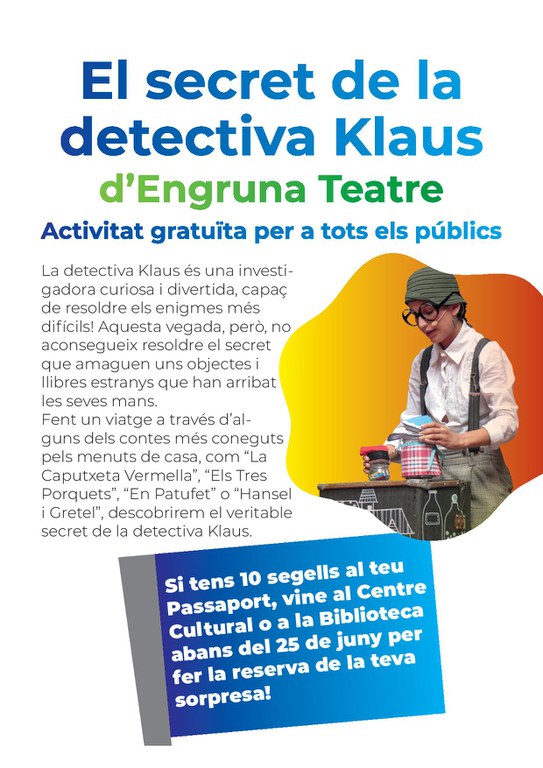 L'espectacle familiar 'La detectiva Klaus' posarà punt i final a la temporada 2018-2019 del Petit Passaport. Prop de 3.000 infants han participat durant aquest curs dels diferents programes d'activitats que han organitzat els equipaments culturals del municipi: Teatre Auditori, Biblioteca, CIP Molí d'en Rata i Centre Cultural. La cloenda tindrà lloc el pròxim 28 de juny, a les 18 h, a la plaça de l'Onze de Setembre, amb l'espectacle familiar 'La detectiva Klaus.' L'acte finalitzarà amb el lliurament d'obsequis a tots aquells infants que hagin omplert el seu passaport.