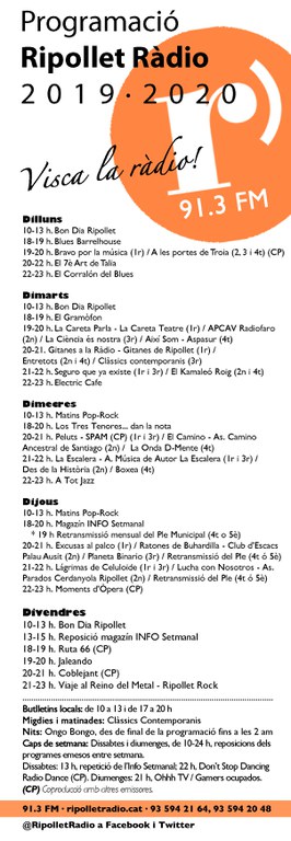 L'emissora municipal ha començat aquesta setmana la seva nova programació, presentada en un acte públic aquest dijous, 19 de setembre, amb la participació d'un bon nombre de col·laboradors. Aquesta temporada 2019-2020, la graella està formada per un total de 33 programes de producció pròpia, entre ells 7 nous espais. 9 dels programades estan realitzats per entitats locals i 23 per col·laboradors apassionats de la ràdio que fan programes d'estils musicals, culturals i especialitzats. A més, els serveis informatius de Ripollet Ràdio continuen oferint l'INFO Setmanal, que passa dels divendres al migdia als dijous, de 18 a 20 h.