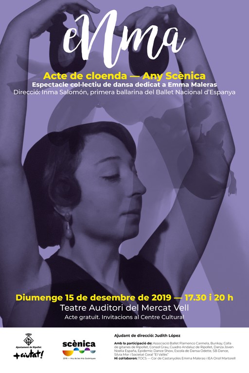 La primera ballarina del Ballet Nacional de España, Inma Salomón, dirigeix l'espectacle col·lectiu eNma, dedicat a la figura d'Emma Maleras, que s'estrenarà el pròxim 15 de desembre, al Teatre Auditori del Mercat Vell com a cloenda de l'Any de les Arts Escèniques. Salomón ha comptat amb la implicació d'una desena d'entitats locals, que han treballat conjuntament durant mesos tant el guió com les coreografies, amb la ripolletenca Judith López, d'Amics del Teatre, com a ajudant de direcció. Les persones interessades a assistir-hi, poden recollir la seva entrada al Centre Cultural a partir d'avui, 2 de desembre, per a un dels dos passis, que tindran lloc a les 17.30 i a les 20 h. Són gratuïtes i es poden recollir fins a un màxim de quatre per persona.