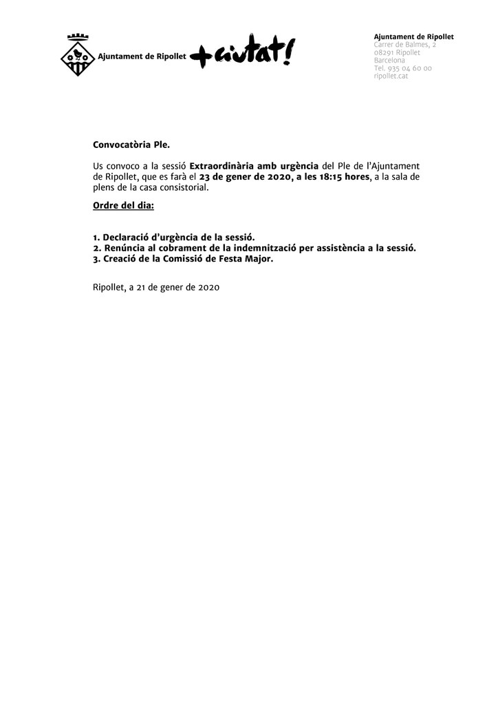 Les persones interessades poden assistir al Ple o seguir-lo en directe a través de Ripollet Ràdio (91.3 FM), ripolletradio.cat i el canal de Youtube Ripollet TV.