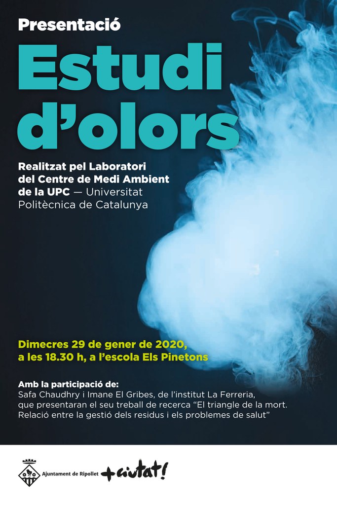 Assumpte: Acte de presentació, obert a tota la població, de l'Estudi d'Olors de Ripollet, realitzat pel Laboratori del Centre de Medi Ambient de la UPC - Universitat Politècnica de Catalunya. Amb la participació de les alumnes de l'Institut La Ferreria Safa Chaudhry i Imane El Gribes, que presentaran el seu treball de recerca "El Triangle de la mort. Relació entre la gestió dels residus i els problemes de salut'.
