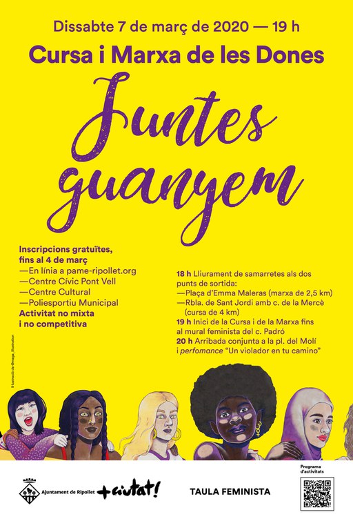 La gran novetat d'aquest programa és la Cursa Marxa de les Dones 'Juntes guanyem', que tindrà lloc el dissabte, 7 de març, a les 19 h. "El món de l'esport és on veuen més acusades les desigualtats que es pateixen entre homes i dones", va assegurar la regidora d'Esports, Andrea Guijarro, que va explicar que es tracta d'una activitat gratuïta, no mixta i no competitiva, on es vol aconseguir la màxima participació possible. A partir de les 18 h es lliurarà a les participants la seva samarreta amb el dorsal 803. Hi haurà dos recorreguts, de 2,5 i 4 km, un per a la marxa i un per a la cursa, que tindran una durada aproximada de 30 minuts i que confluiran davant del mural feminista del carrer de Padró, on es farà l'avituallament i es lliurarà un got amb el lema del 8M. Des d'allà, totes les participants arribaran plegades a la plaça del Molí, on es farà la performance "Un violador en tu camino". Per a participar cal inscripció prèvia, fins al 4 de març, en línia al següent enllaç i al web d'Esports i o presencialment, al Centre Cívic del Pont Vell, el Centre Cultural o el Poliesportiu Municipal.