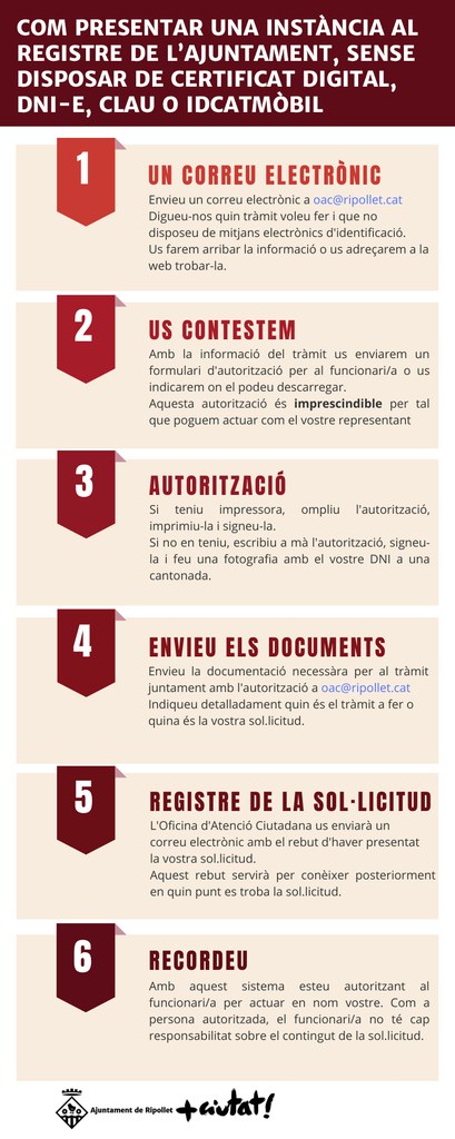 Per tal de facilitar l'accés i la tramitació, també s'ha editat una informació per a la ciutadania amb les instruccions per tal de presentar una instància al registre de l'Ajuntament, sense tenir certificat digital, DNI-e, Clau o IdCatMòbil (imatge adjunta).