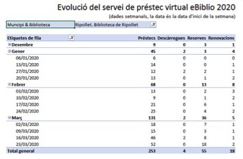 Durant aquestes setmanes de confinament, el préstec de llibres electrònics a través de la plataforma eBiblio és el servei que està gaudint de més demanda i ha experimentat un fort creixement. Només des del 16 de març, el servei ha augmentat en més d'un 340% en préstecs virtuals. Mentre a principis d'any se servien una quarantena de títols mensuals, al mes de març s'han enregistrat fins a 155 títols de llibres digitals prestats (consulteu taula de dades a la imatge adjunta).